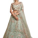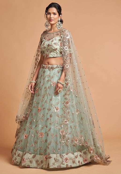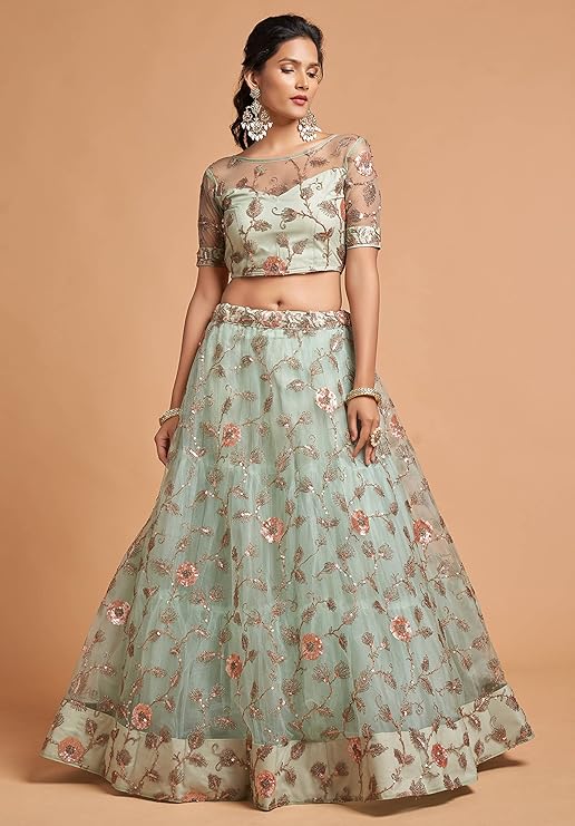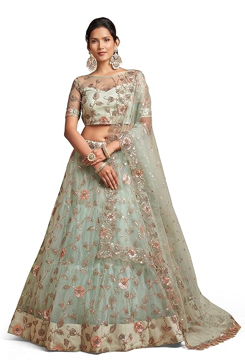Lehenga Fabric: Net; Blouse Fabric: Net; Dupatta Fabric: Net; Inner: Santoon With Cancan(Tulle) Layered Net Lehenga Work: Zari, Thread, Dori & Sequins Embroidery; Blouse Work: Thread, Dori, Zari & Glitter Sequins Embroidery; Dupatta Work: Thread, Zari, Dori & Sequins Embroidery Measurements: Lehenga(Semi-Stitched) Flair : 3.50 Mtr, Waist-43", Height-42"; Blouse(Unstitched) Size: Up To 44"; Dupatta Length: 2.25 Mtr Package Contains: 1 Semi-Stitched Lehenga With Dupatta And Unstitched Blouse Wash Care: Dry Clean Only