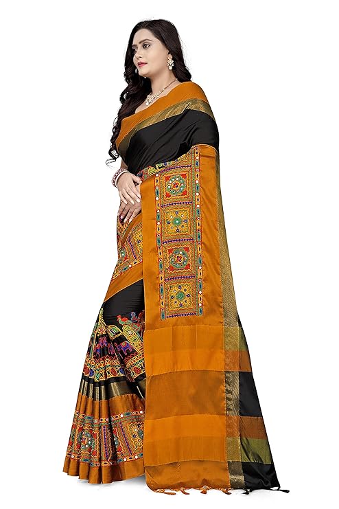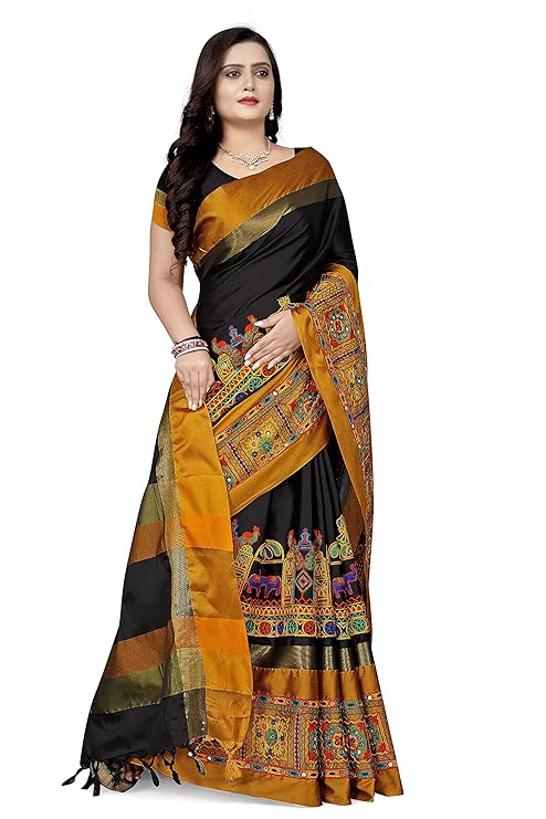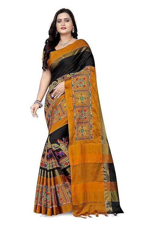 Saree fabric : cotton Silk. / / Blouse fabric : cotton silk Blouse fabric Work : Heavy Kutchi Work With Elephant Design Saree Saree Length : 5.5 Mtr Blouse Length : 0.8 Mtr. Pack of 1 saree : : 1 blouse Type :Party/Exclusive Wear Saree