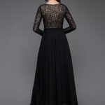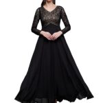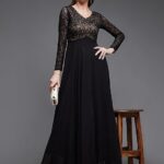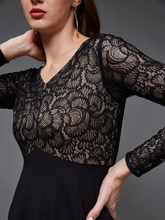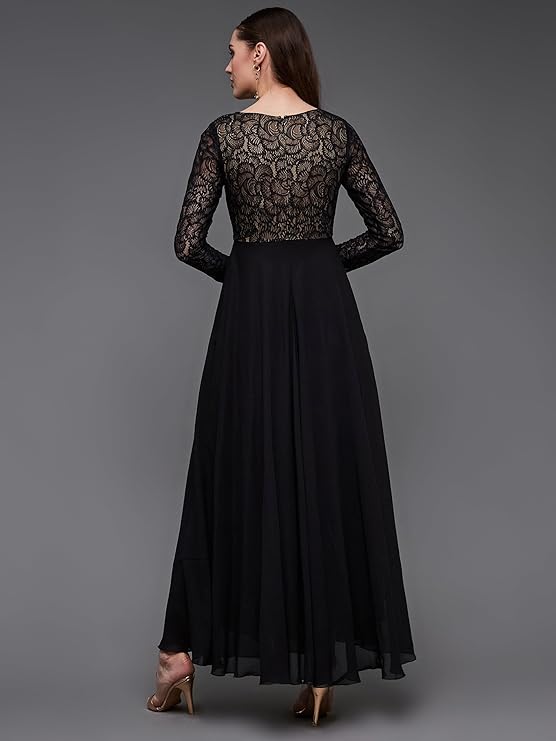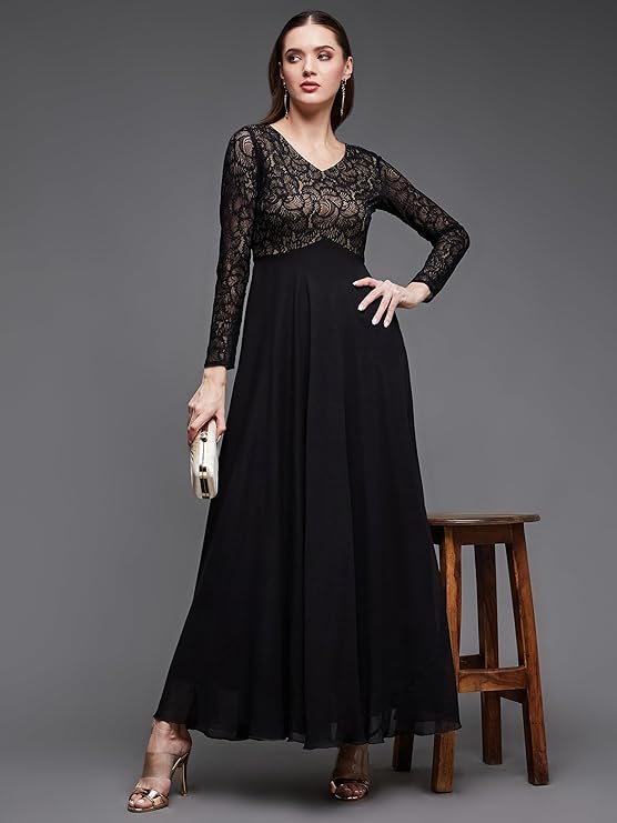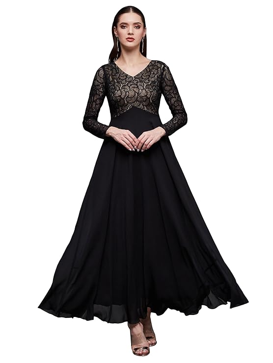 Fabric: 100% Polyester | Wash Care: Cold machine wash with similar colors, do not bleach, tumble dry low, warm iron Style: Lace Overlaid | Pattern: Self Design | Fit: Relaxed Fit | Length: Maxi | Closure: Zip | Neck: V-Neck | Sleeves: Full Sleeve | Pockets: Yes, 2 Side Pockets Occasion: Party Wear, Casual Wear, Daily Wear, Evening Wear The model is 5'9" and she is wearing size S. There might be slight color variation between the actual product and the image shown on the screen due to photoshoot lightining.