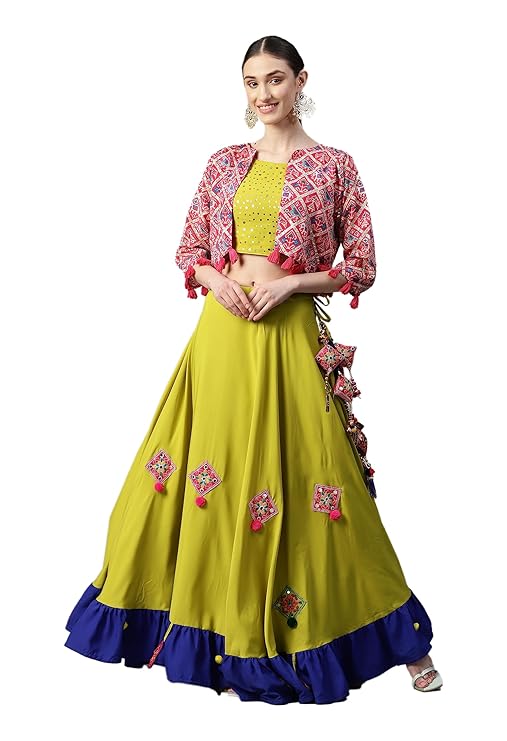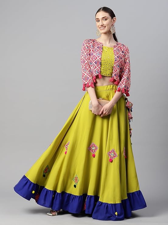 || Lehenga Color: Fluoresent Green || Choli Color: Fluoresent Green || Koti Color: Pink || Lehenga Fabric: Maslin Cotton || Choli Fabric: Maslin Cotton || Koti Fabric: Cotton || SIZE (Unstitched): UPTO 44 BUST AND 42 WAIST || Lehenga Work: THREAD EMBROIDERED WORK || Choli Work: MIRROR WORK || Koti Work: SEQUINCE EMBROIDERED WORK || Choli Length (Unstitched) : 0.8 Meter || Lehenga Length (Unstitched): 42 INCH || Koti Length (Ready To Wear: 42 Size || Occasion: Navratri Night , Wedding Night & Party Wear || LOOK: Traditional Navratri || Weight: 2 KG || Package Contains: 1 Semi-Stitched Lehenga With Top Koti And Unstitched Blouse Wash Care: Dry Clean Only