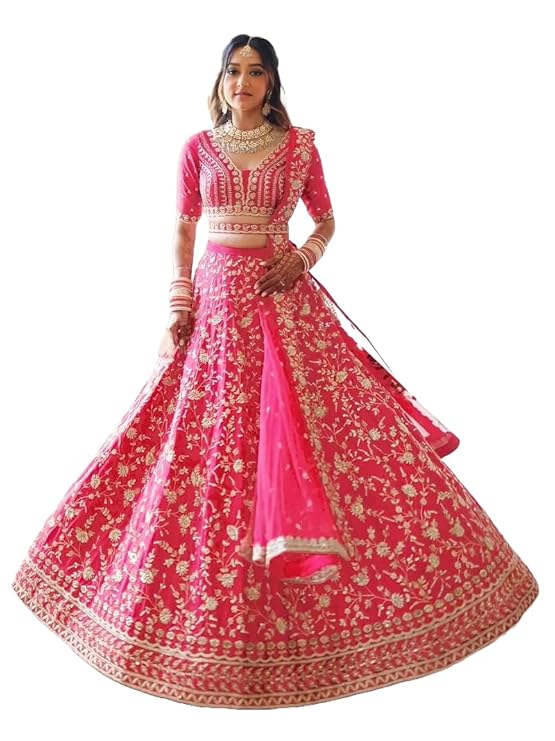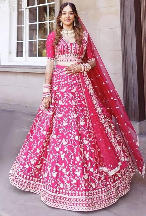 Lehenga Fabric: malay satin silk ; Blouse Fabric: malay satin silk ; Dupatta: Soft Net; Inner: Santoon with Cancan(tulle) layered net Lehenga Work: Zari and Sequins Embroidery Work; Blouse Work: Zari & Sequins Embroidery; Dupatta Work: Zari and Sequins Embroidery with Lace Measurements: Lehenga(Semi-Stitched) Flair : 360mtr, waist-43", height-43"; Blouse(Unstitched) Size: up to 44"; Dupatta Length: 2.25 mtr Package Contains: 1 Semi-Stitched Lehenga with 1 Dupatta and 1 unstitched Blouse Color: Pink color in Full Set Stitch type: - Lehenga - Semi Stitched, Choli - Unstitched, Dupatta - Fully stitched.